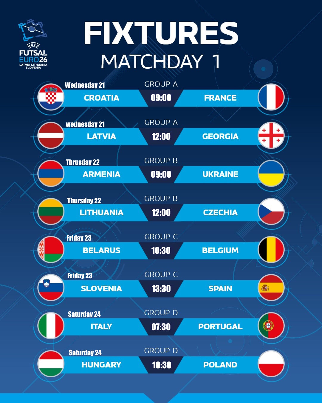 Hoy inició la Eurocopa de Futsal de la UEFA con el empate a dos goles entre Croacia y Francia. La Euro 2026 se está jugando en Letonia, Lituania y Eslovenia.