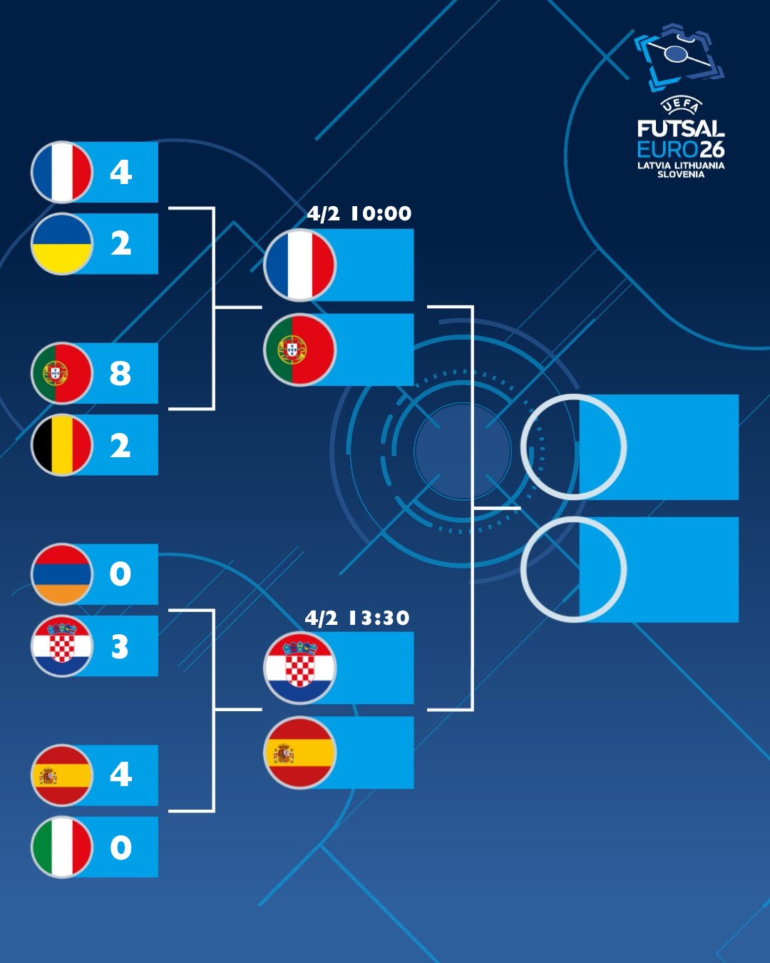 El día sábado, Francia derrotó a primera hora a Ucrania con bastantes dificultades siendo el marcador final de 4 por 2. A segunda hora, Armenia, líder del Grupo B, caía ante Croacia por 3 a 0. Ya el día domingo, Portugal goleaba por 8 a 2 a una Bélgica que se adelantó en el marcador, pero no pudo mantener el ritmo de los portugueses. Para finalizar los cuartos de final, España cumplió con autoridad ante una fuerte Italia, 4 a 0 fue el marcador final en una dura prueba para los españoles.